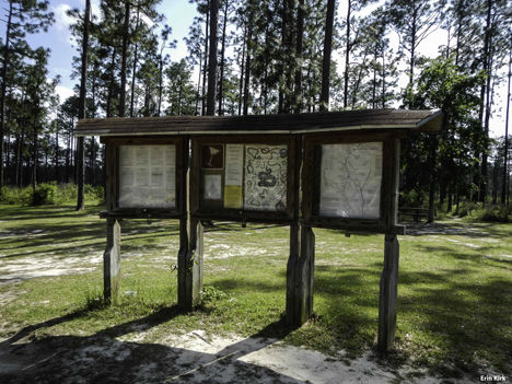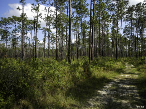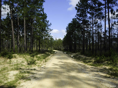 Chuck-will’s-widow while you are waiting. As the light increases you will begin to hear the distinctive song of the second most sought after species at DeSoto: Bachman’s Sparrow, soon joined by Prairie Warbler, Yellow-breasted Chat and a variety of other species. If you happen to visit in the winter, you may spy Le Conte’s Sparrow in the masses of broom-sedge present on the property. Hunting is allowed on portions of this large site. For your own safety, wear highly visible blaze orange hunting clothes during hunting seasons. Information on hunting seasons can be found by clicking on the Hunting icon below. The GPS coordinates give to the right are for the entrance to the trail. Travel North-North West to the parking area.