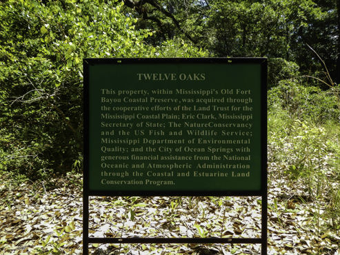 This site, aptly named for its spectacular live oaks situated along Old Fort Bayou, is owned and operated by The Land Trust of the Mississippi Coastal Plain. It is open from dawn to dusk. Three walking trails wind through southern mixed hardwood forest and skirt a bayhead swamp and tidal marsh. An observation deck overlooks the bayou. This site is surveyed on a regular basis by a team from the Mississippi Coast Audubon Society who report that it a good place to observe migrants and that Clapper Rail and an occasional Least Bittern can be found in the marsh.